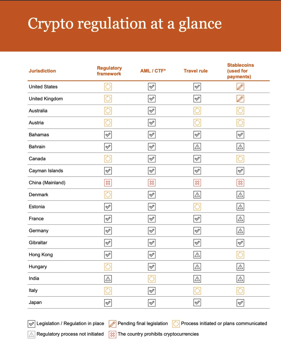 Overall, the current state of crypto regulation is a complex and rapidly evolving landscape, with different countries and regulatory bodies taking different approaches to the industry. While some countries have been more proactive in their approach to crypto regulation than others, there is a general trend towards increased regulation and oversight of the crypto industry worldwide.